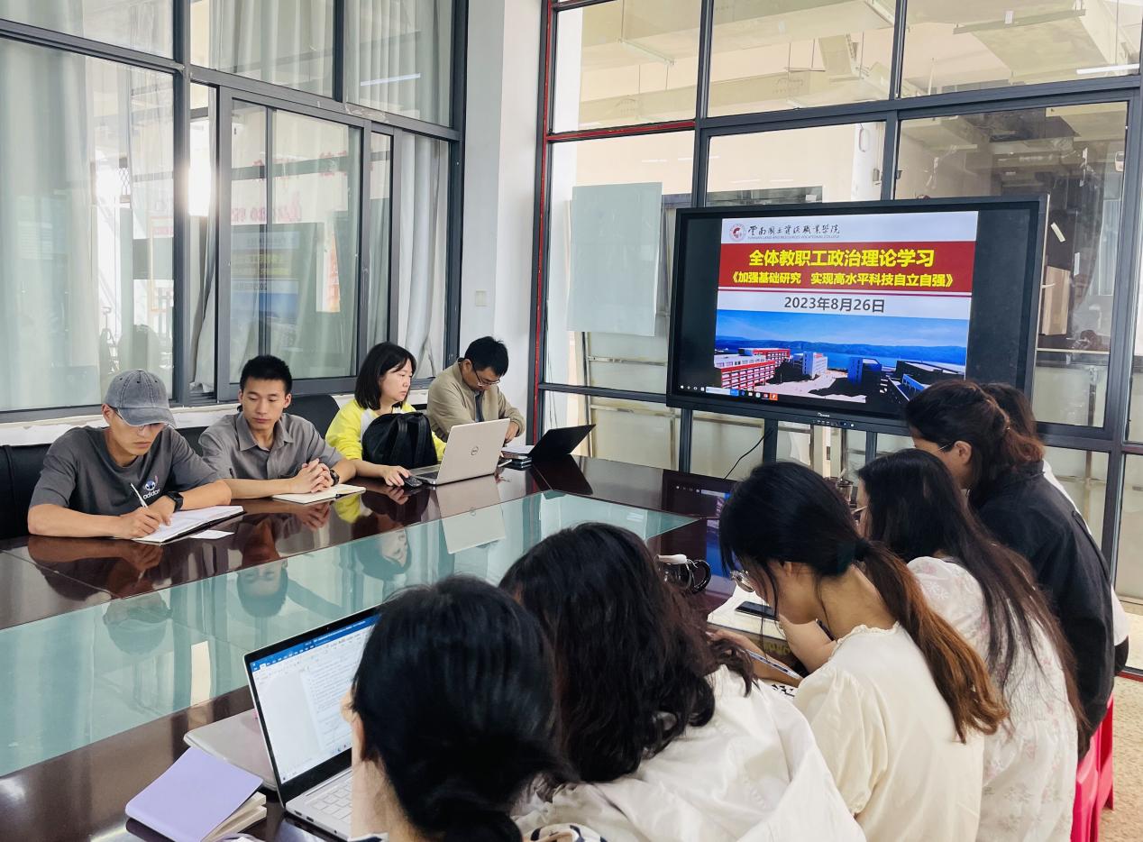 会议开始,学院党总支书记王春莲首先带领全体教职工就《求是》杂志发表的习近平总书记重要文章《加强基础研究 实现高水平科技自立自强》进行了学习,并希望全体教职工要结合学院的专业特长和制造业的发展趋势,深刻领会基础研究之于职业教育的意义,深度挖掘适合学院实际情况的基础研究之路,积极参加学院、学校探索搭建的国际交流平台活动,积极参与行业共同体建设,努力将老一辈革命先烈的“两弹一星”精神、西迁精神等运用在日常工作中,真正实现以学院教职工创新能力的提升驱动学院高质量发展。接着,她传达了暑假相关文件精神,对暑假开展的各类学习培训活动、就业核查工作、现代学徒制稳岗活动等进行了总结,并就即将开展的2023级学生的迎新活动、新生入学教育、军训等工作进行的安排。她希望全体教职工要提前梳理本学期的工作,各司其职、各就其位、团结协作,确保各项工作有条不紊地进行。