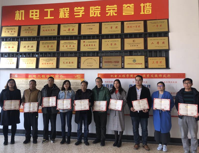 最后,学院院长秦忠老师对各教研室汇报中提出的问题和困难做一些回答,并传达了学校近期的一些会议精神,针对“以赛代考”、实验室设备采购等做相关说明。会议结束后,全体教师合影,张颖老师为2019年度学院“优秀教师”和“优秀教育工作者”颁发荣誉证书。