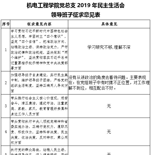 第三阶段,广泛征求意见和谈心谈话阶段。根据校党委组织部和学院民主生活会方案的相关安排,机电学院于4月8日到4月16日开展意见征求和谈心谈话工作。