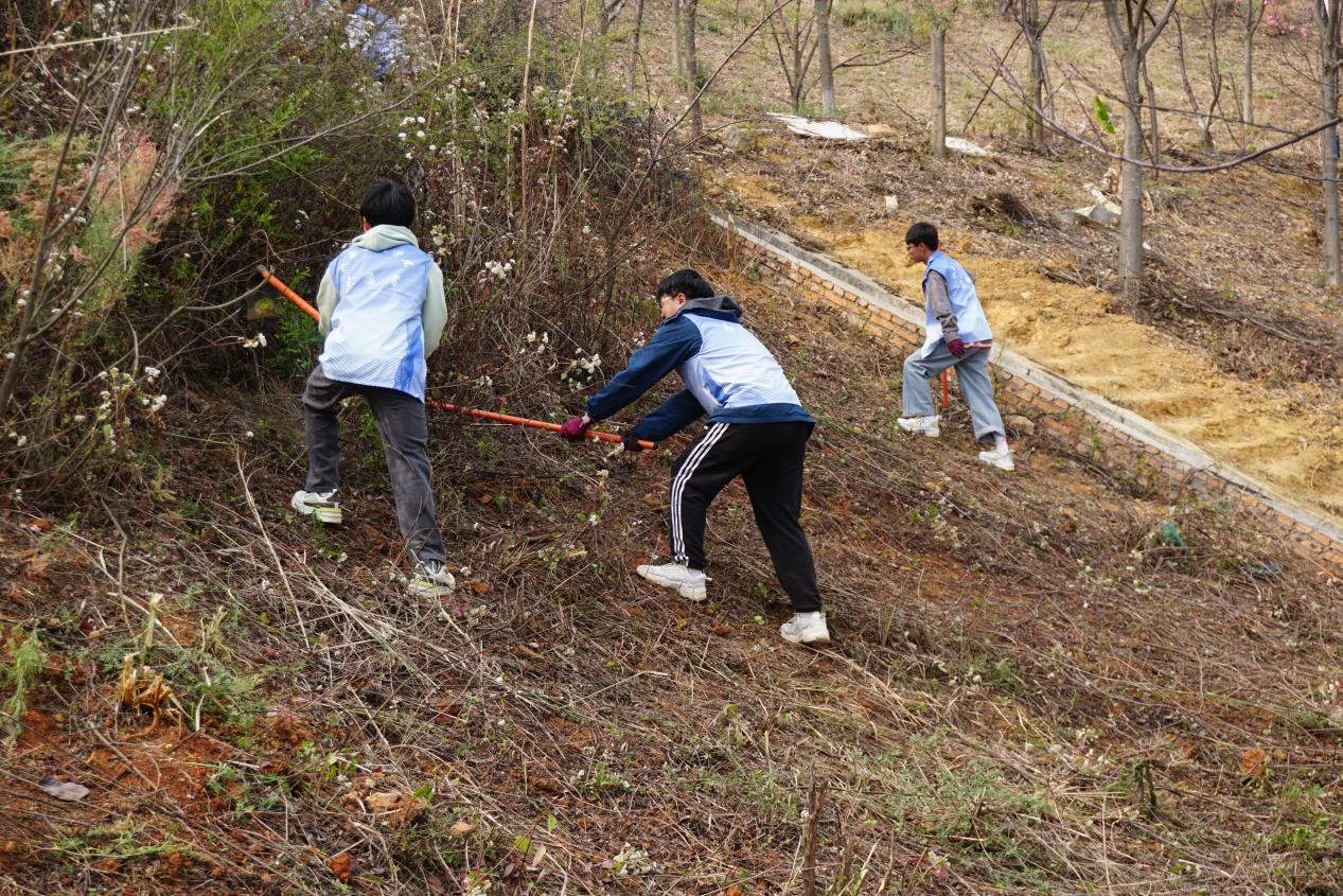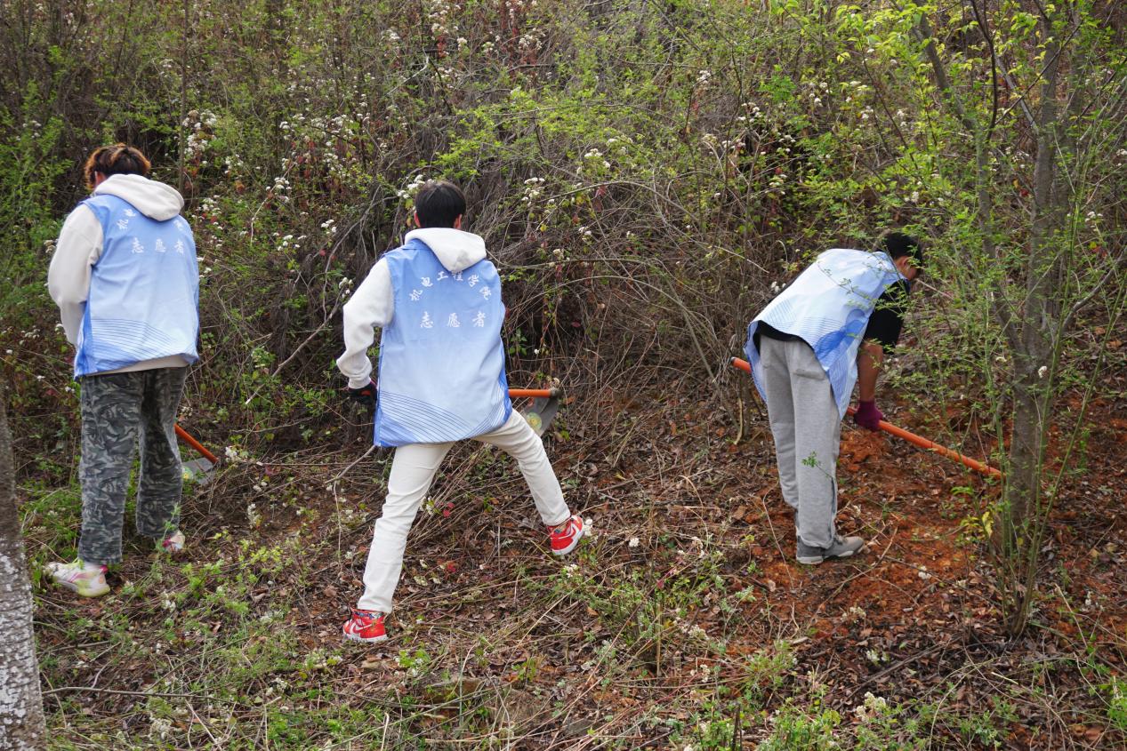 活动期间,志愿者们分为五个小组,分别对樱花谷各个地方进行杂草、垃圾清理。男生拿着锄头清理杂草,女生提着垃圾袋拾起积存垃圾,蓝白色的志愿者服形成一道别样的风景。经过清理,樱花谷焕然一新,花坛内、人行道上整洁明亮。
