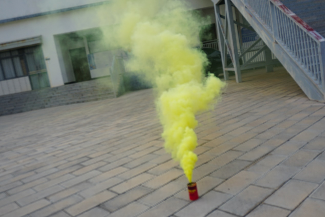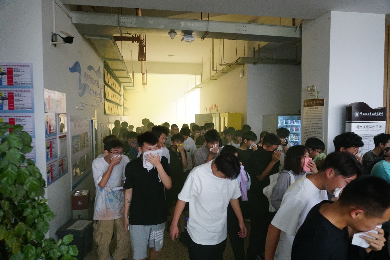 在演练开始前,王亚文老师带领同学们认真学习演练方案,详细告知演练注意事项,并给同学们发放毛巾。随即演练开始,老师们点燃烟雾弹模拟火灾发生时的烟雾灰尘。