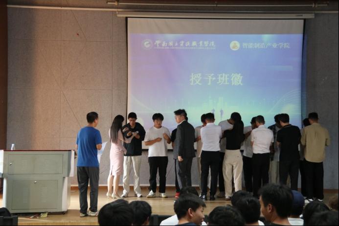 企业代表向订单班学生授予班徽。