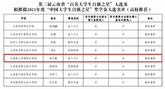 近日,由共青团云南省委、云南省学生联合会及有关单位联合开展的第三届云南省“百名大学生自强之星”寻访活动结果已揭晓,我院2020级电气三班团支部杨东夔同学被评为云南省“百名大学生自强之星”。