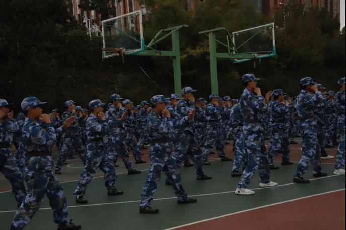 在夕阳的余晖中,是教官严格训练的场面,是同学们刚毅充满活力的脸庞 ,从摆臂到踢腿,从握拳到绷腿,每一个动作教官都亲自示范与分解指导。