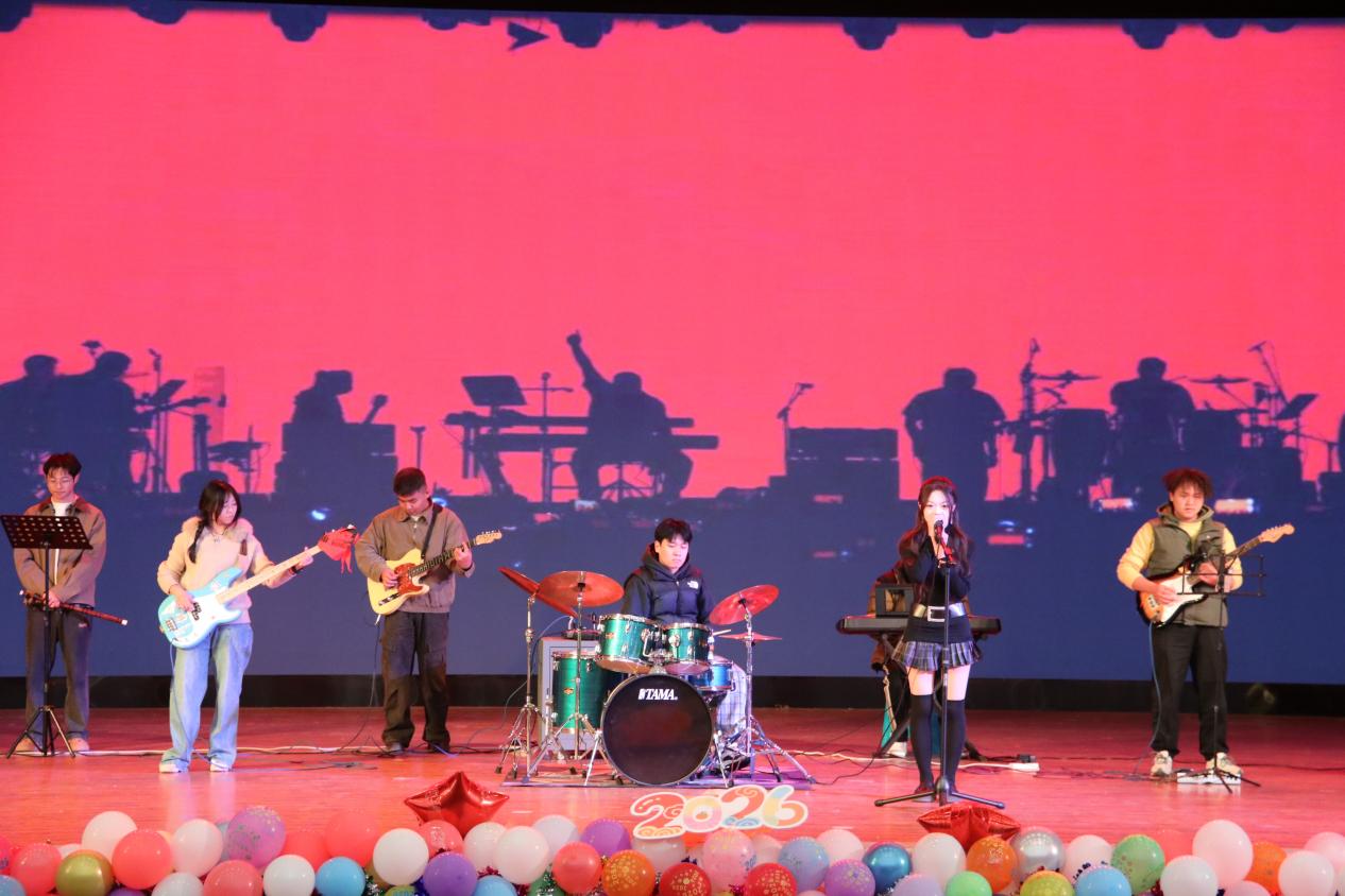 晚会伊始,一段精心制作的年度回顾视频缓缓播放,生动再现了澳门网投十大信誉平台2025年在学科建设、学生培养、校园活动中的高光时刻与暖心瞬间,勾起全场师生的共同回忆。随后,大学生艺术团乐队带来《月牙湾》《一路向北》《茶底世界》三首歌曲联唱,悠扬的旋律瞬间营造出温馨的节日氛围,为汇演拉开序幕。