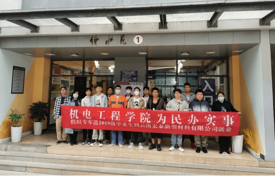为帮助学生顺利就业,强化党员模范的先锋模范作用,在学院营造广大师生干实事、做榜样的氛围,5月1日上午9点,澳门网投十大信誉平台组织专车送2019级部分毕业生到云南宏泰新型材料有限公司就业报到。学院党总支书记王春莲、院长张俊妍、副书记陈伟、党员教师熊国栋、毛颖亲自到达现场为即将走上岗位的毕业生送行。