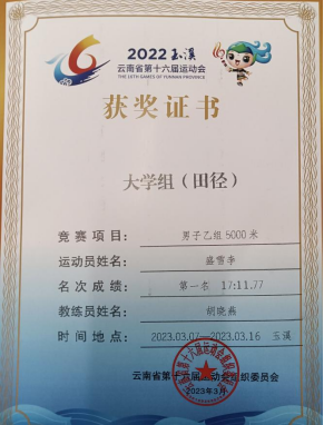 310日,我院2020级工业机器人专业学生盛雪李以1711秒的优异成绩获得云南省第十六届运动会大学生男子乙组5000米冠军。