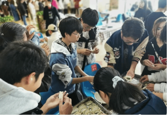上午十一点,师生欢聚食堂,待食堂工作人员将准备好的食材一一摆放上桌后,师生齐上阵,有的撸起袖子加入包饺子的大阵营中,有的在做“督导员”,有的在创新各式各样的饺子,有的在切磋手艺,有的在拍照留念,师生同乐的暖意沁人心脾。随后,在大家的满心期待下,热腾腾的饺子出锅了,吃着自己亲手包的饺子,享受着自己的劳动果实,心中充斥着甜蜜,脸上洋溢着笑容。