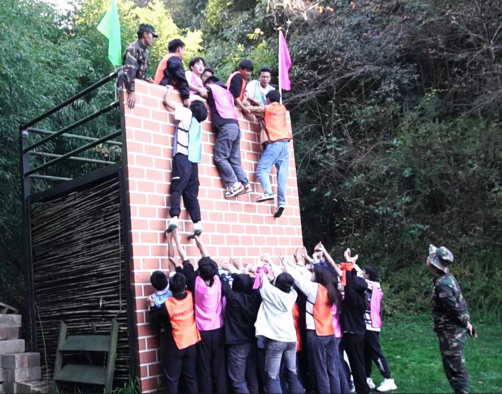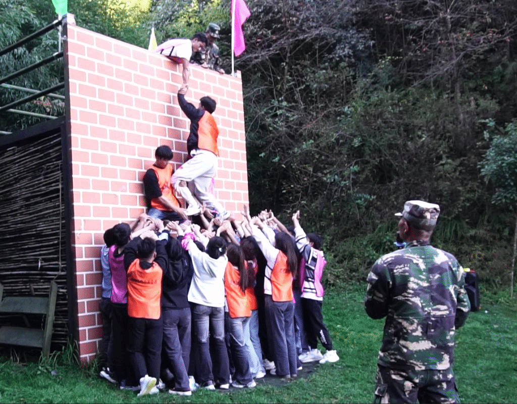 最后是“荣辱与共”项目,充分体现了大家身上不抛弃、不放弃、共进退的精神。面对4米多高的毕业墙,全体学生干部在教练的带领下,不断发挥团队的力量,互相支持和鼓励、在团队中承担自己的责任。在不能借助任何外界工具的情况下,通过搭人墙的方式,所有队员成功翻越4.2米的高墙。在此过程中,大家流泪、流汗、受罚,但大家没有畏惧、退缩,更没有放弃任何一个人。这个项目让大家懂得个人目标与集体目标的关系——只有团队获得胜利才是真正的胜利。