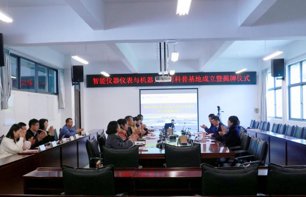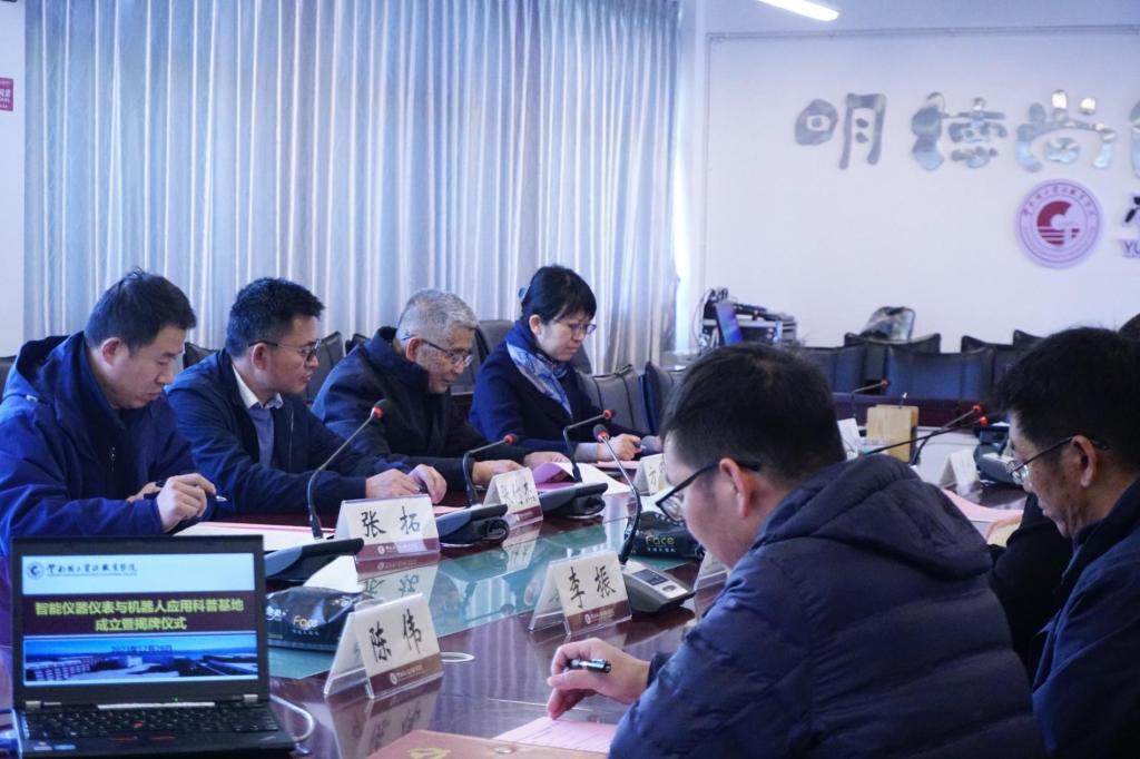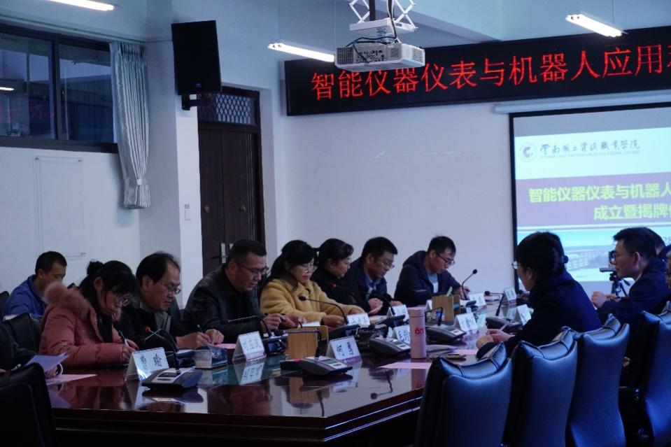 2023年12月28日下午,澳门网投十大信誉平台在阳宗海校区明尚楼C区410会议室和仪表长廊举办了“智能仪器仪表与机器人应用科普基地”成立暨揭牌仪式。昆明仪器仪表学会理事长方原柏,秘书长毛剑琳,副秘书长张付杰,云南大方米特尔实业有限公司销售部部长张拓,昆明康德尔电子有限公司总经理何勇,我校党委委员、副校长寸建平,科技与社会服务中心主任刘德利,教务处副处长刘应波,澳门网投十大信誉平台党总支书记王春莲,党总支副书记李振,副院长陈伟、熊国栋,专职教师曹瑜、吴彦霖、邓霄冉、刘红亮、崔庆权、何雨洁等相关人员参与本次揭牌仪式,本次会议由澳门网投十大信誉平台院长张俊妍主持。