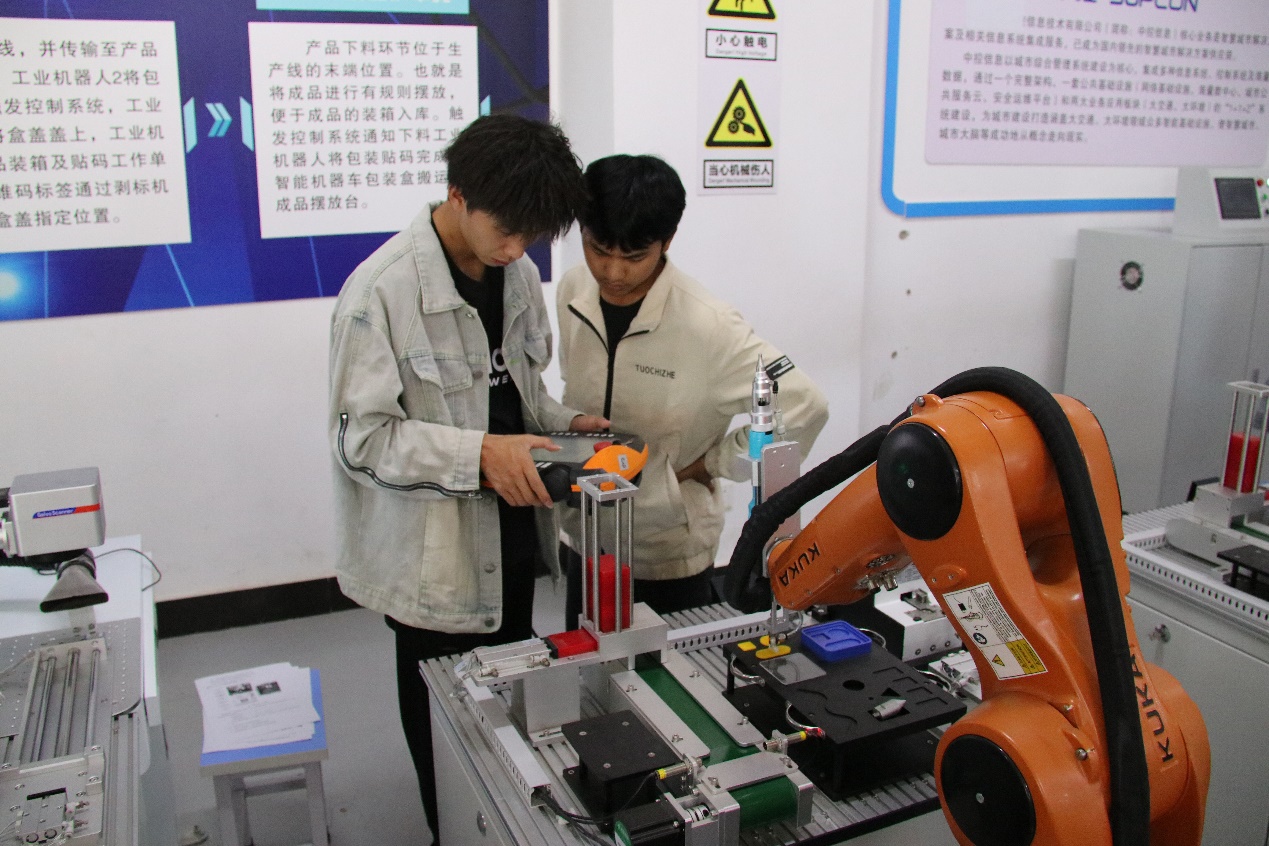 赛场上,选手们需将理论与实践紧密结合,创建相应程序,确保机器人能按照工艺要求正确运行。比赛中,选手们全神贯注,动作精准敏捷,充分展现了他们对专业知识的深刻理解和实践能力。