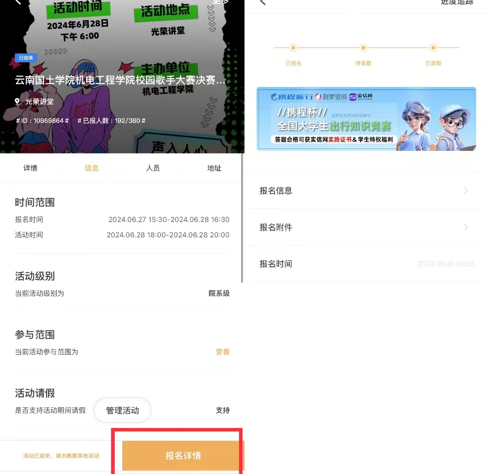 评审制:学生在报名期间进行报名,报名人数可超过活动最大参与人数,在报名开始时间到活动开始时间段内由活动管理员在App端手动录取本次活动的最大参与人员名单。