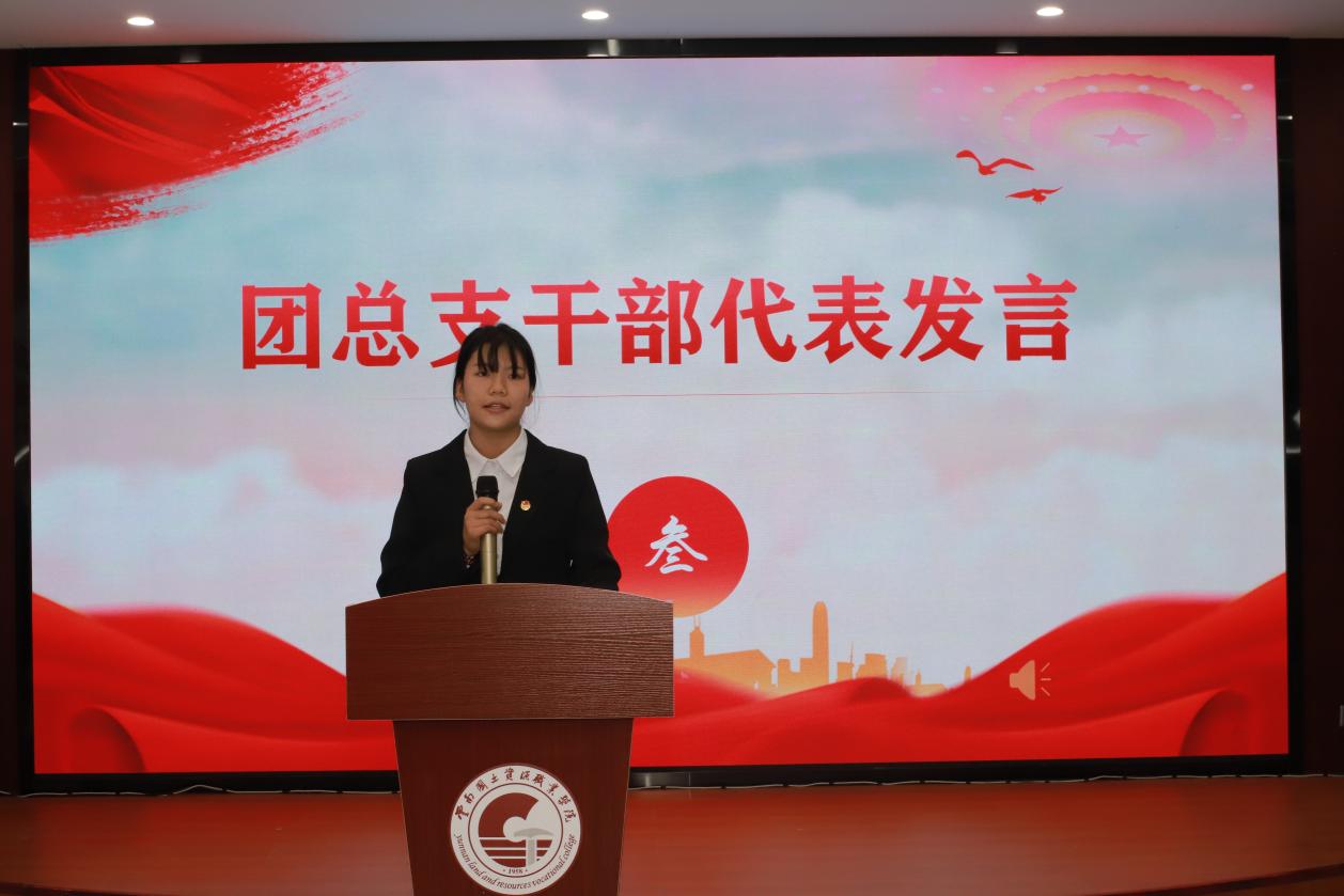 第四项议程:团总支负责人马玲老师作总结发言。她强调,学生干部应以担当为笔,书写奉献篇章。在工作中要保持热情与责任感,积极组织各类活动。同时,要注重团队协作,提升自身能力,为学院发展贡献力量,共同营造积极向上的校园氛围。