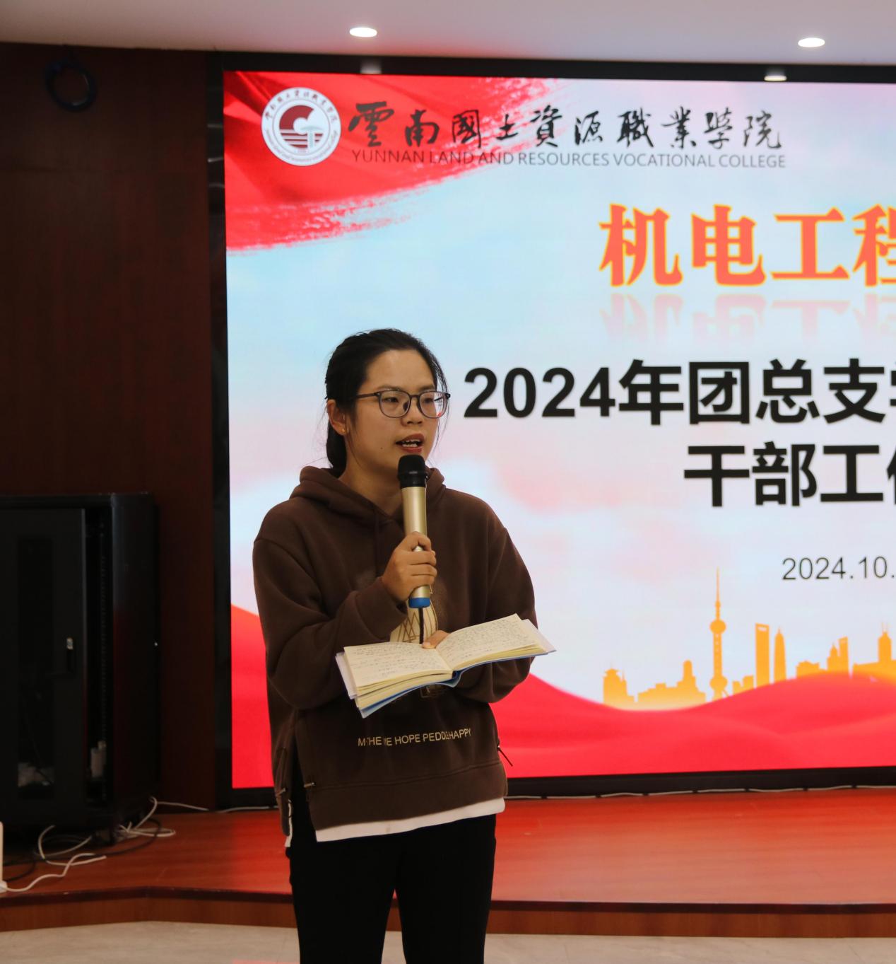 第三项议程:团学干部代表发言。团总支第二课堂中心部长张丽表示,在机电大家庭她收获知识并成长为有用之人,她认为团学工作与所有同学紧密相连,要注重沟通与合作。学生会权益服务部部长马国银表示,今后将注重部门建设、提升部门凝聚力,倡议各部门要为学院发展贡献力量,共创美好校园生活。