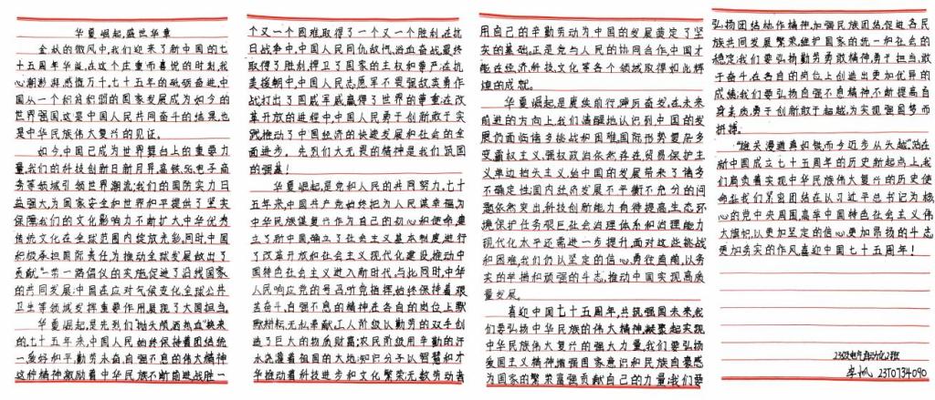 这些作品涵盖了丰富多样的内容,有的同学以细腻的笔触深情讲述了革命先辈们在艰难岁月中的英勇事迹,字里行间流露出对他们的无限敬仰之情;有的同学充分结合自身成长经历,通过第一视角叙事了红色基因对自己学习和生活中所产生的深远影响,展现了红色精神的代代相传;还有的同学以其独特视角展现了祖国在新时代波澜壮阔的伟大变革,通过具体案例剖析,坚定了实现中国式现代化的信心与决心。
