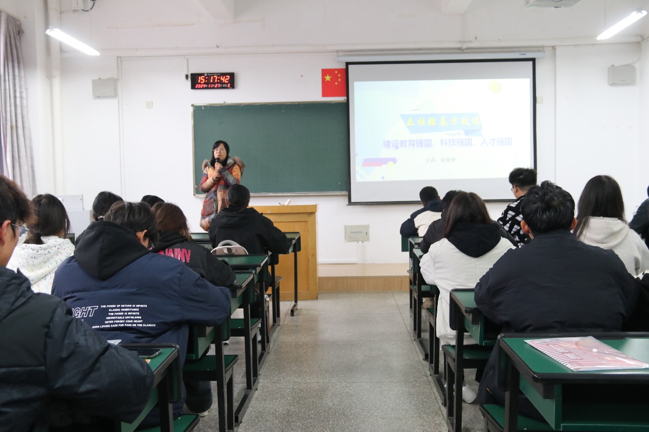 课上,张俊妍老师围绕“教育优先发展”“科技自立自强”“人才引领驱动”“高校集中优势”这四个板块展开授课。她以党的二十大报告中关于教育、科技、人才是全面建设社会主义现代化国家的基础性、战略性支撑的论述为切入点,着重强调了三者统筹推进的重要意义。张老师强调,在科技迅猛发展的今天,职业教育要紧密对接国家发展战略与市场需求,持续优化专业设置与课程体系,从而培育出更多契合新质生产力发展要求的高素质人才。张老师激励同学们树立正确的职业观与终身学习理念,深刻认识到职业教育的光明前景,全力提升自身综合素质,为中华民族伟大复兴的中国梦添砖加瓦。