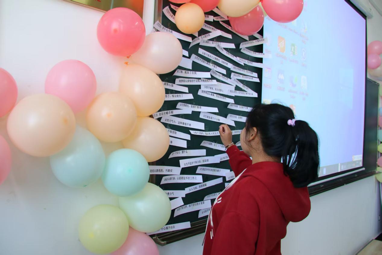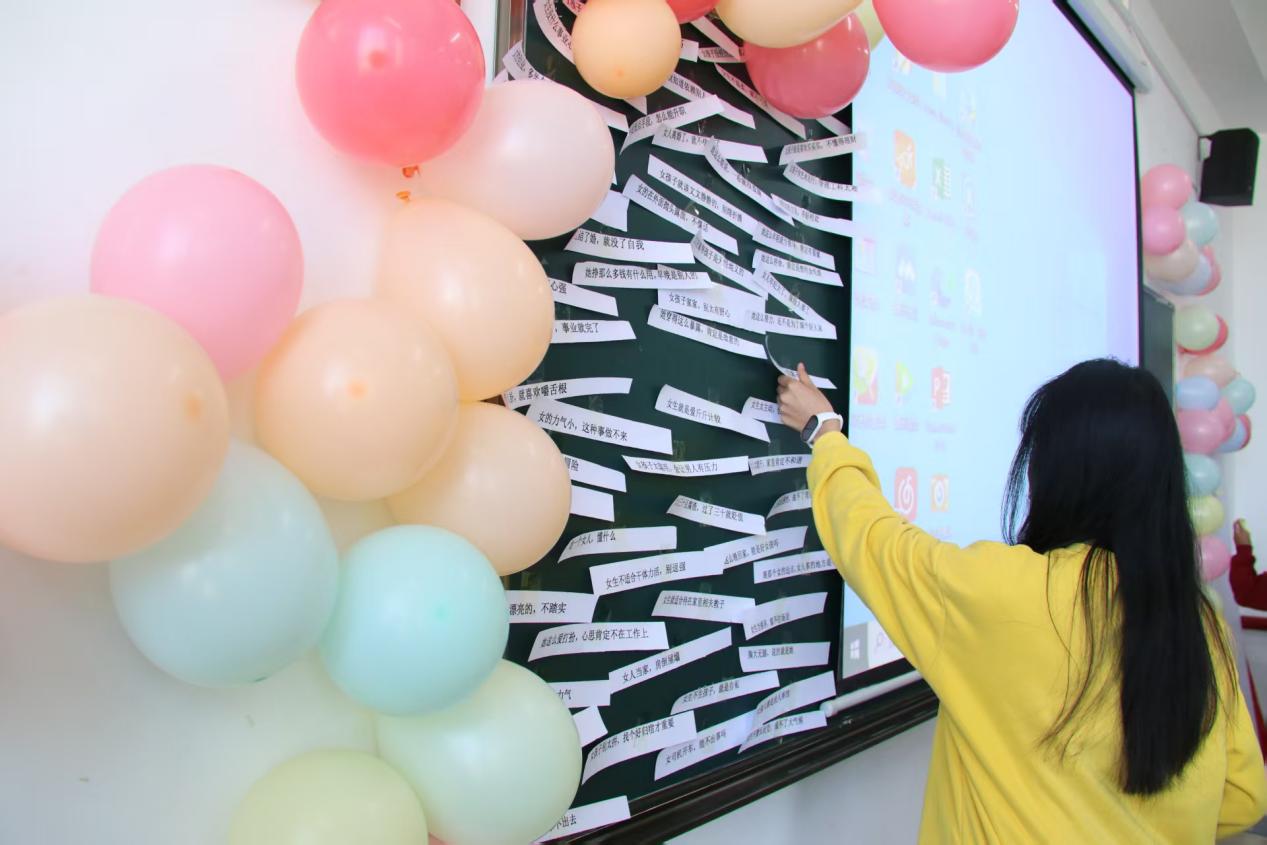 活动进入“撕掉标签,自己定义”环节。无论是为特定的“她”,还是向女性群体表达敬意,最真挚的祝福、最深情的赞美、最温暖的鼓励都被写在标签墙上。同学们相互交流,增进了彼此之间的友谊。她们分享着生活中的趣事和学习中的点滴,整个活动现场充满了欢声笑语。