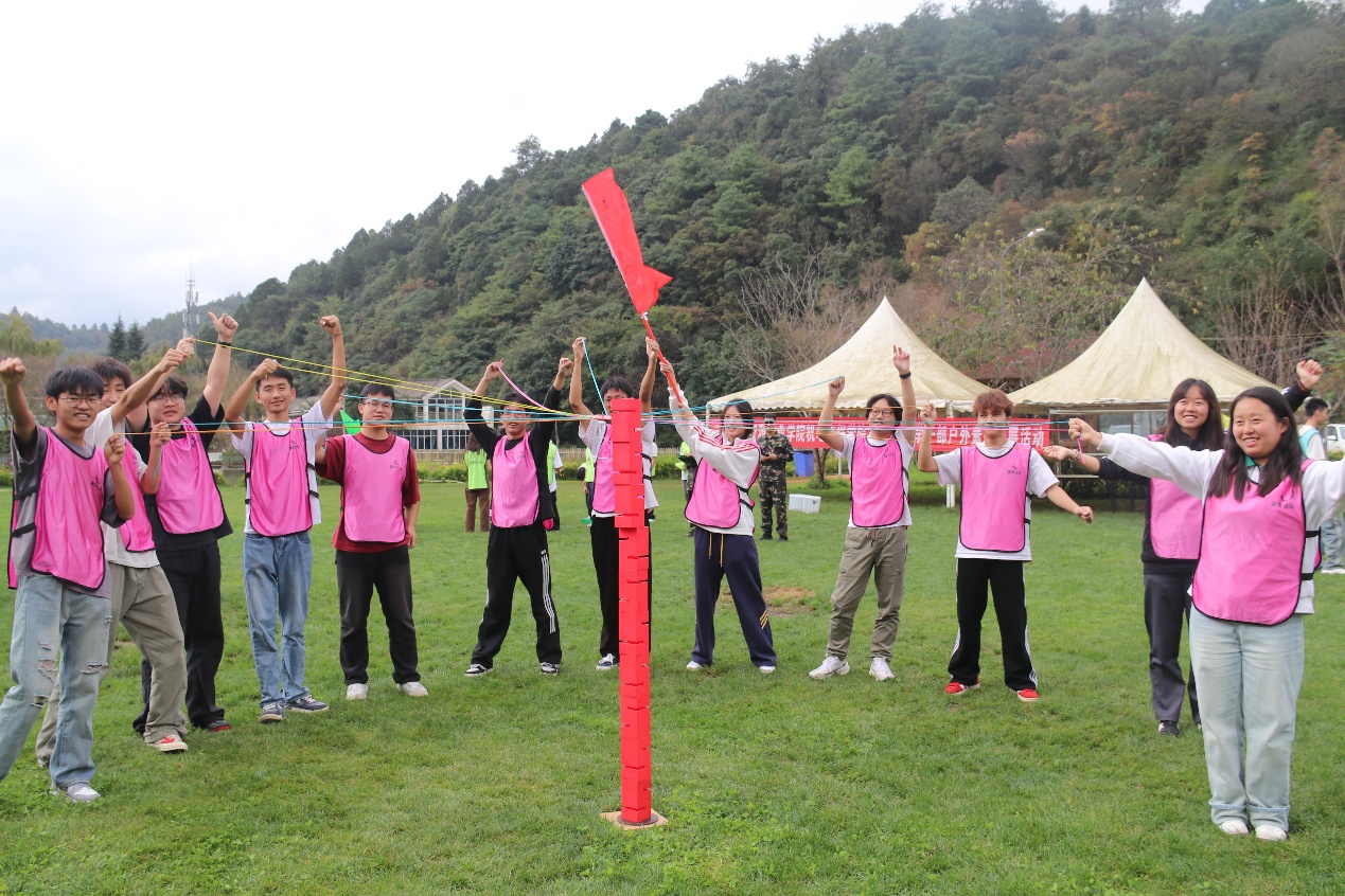 在专业教官的指导下,同学们通过随机报数迅速组建团队,共同完成了队名、口号和队旗的设计,并进行了风采展示,快速融入了集体氛围。随后,各小队相继参与了“珠行万里”“鼓动人心”等经典协作项目。这些活动寓教于乐,不仅考验了队员间的默契与沟通,更让大家深刻体会到资源整合与信任协作的重要性。