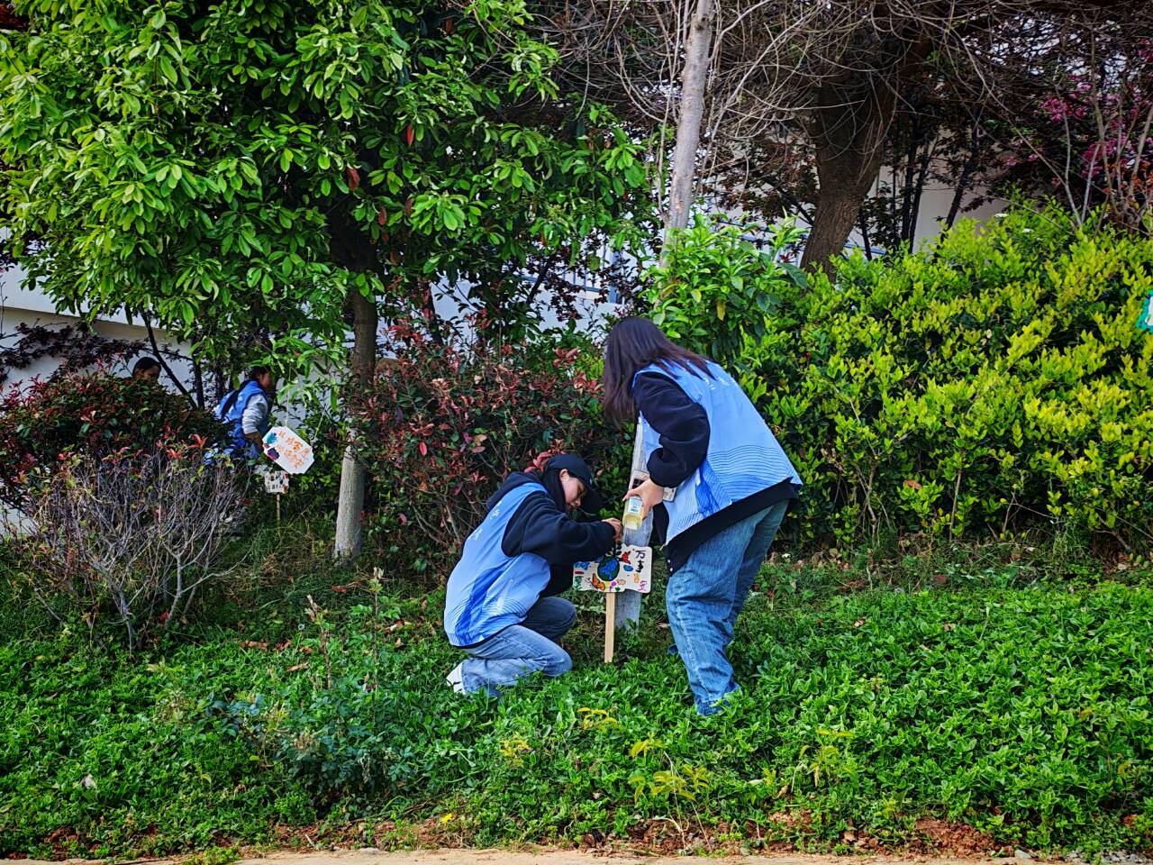 活动伊始,张颖书记勉励青马学员以植树节为契机,将爱绿护绿的意识转化为实际行动,为绿色校园建设贡献青春力量。随后,学员们专注绘制植树节专属环保标语木牌,完成后前往校园绿化区,将木牌精心插在林间、悬挂于枝头,用这些富有创意的木牌为校园绿植挂上“守护标识”,以独特的方式传递植绿、爱绿、护绿的核心理念。