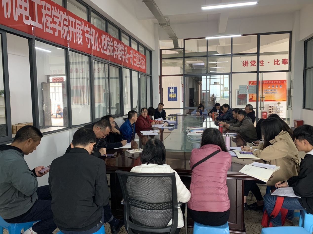 接着,王春莲同志组织各位与会教师围绕“廉洁从教、服务学生”主题开展师德师风大讨论。与会老师们积极参与讨论,现场氛围热烈,其中,机电党支部书记熊国栋同志说到,我们要认真贯彻习近平新时代中国特色社会主义思想,履行党员义务,将思政教育贯穿课堂教学,培养合格人才;智控党支部书记于兰同志说到,作为党员教师,要坚持初心,身体力行,尽力为学生解决各种实际问题,做到燃烧自己照亮别人;机电教研室主任邹艳红老师说到,作为教师,上好每堂课是基本要求,我们要认真备课,将思政教育融入备课中,改进教学方法,服务好每一位学生。