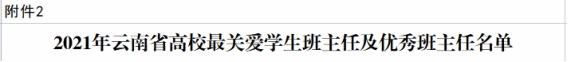 2021年云南省最美高校辅导员、最受学生敬佩辅导员和最关爱学生班主任评选经各学校党委审核推荐,省委教育工委组织专家评审、集中评议、结果复核、对外公示等程序,共评选出“最美高校辅导员年度人物”10名,“最受学生敬佩辅导员”10名,“优秀辅导员”61名,“最关爱学生班主任”10名,“优秀班主任”64名。获评的165名高校辅导员和班主任坚守为党育人、为国育才的初心使命,展现了新时代人民教师昂扬向上的精神风貌 。