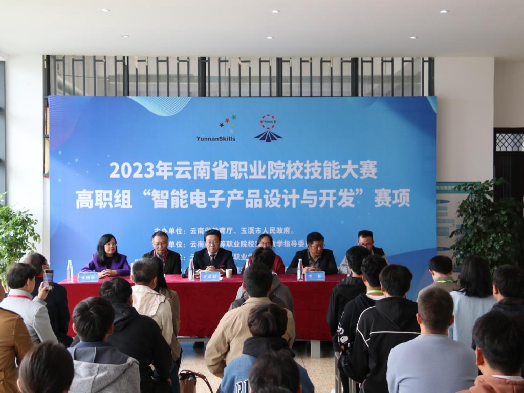 10月9日下午,由云南省教育厅、玉溪市人民政府主办的2023年云南省职业院校技能大赛“智能电子产品设计与开发”赛项开幕式在我校举行。本次开幕式由我校澳门网投十大信誉平台副院长陈伟主持,学校党委委员、副校长齐武福,教务处副处长李艳丽、澳门网投十大信誉平台院长张俊妍、党总支副书记李振,昆明谦而诚科技有限公司、北京杰创永恒科技有限公司技术支持人员,大赛裁判、仲裁人员及各参赛院校老师和参赛选手共同参与。